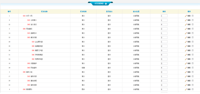 我們創(chuàng)建的欄目,以及默認(rèn)的欄目,都要在這里進(jìn)行管理。點(diǎn)擊欄目管理,右側(cè)信息會出現(xiàn)我們整個(gè)網(wǎng)站的所有欄目名稱、欄目性質(zhì)、是否顯示、顯示位置、排序和操作等信息。如圖所示: