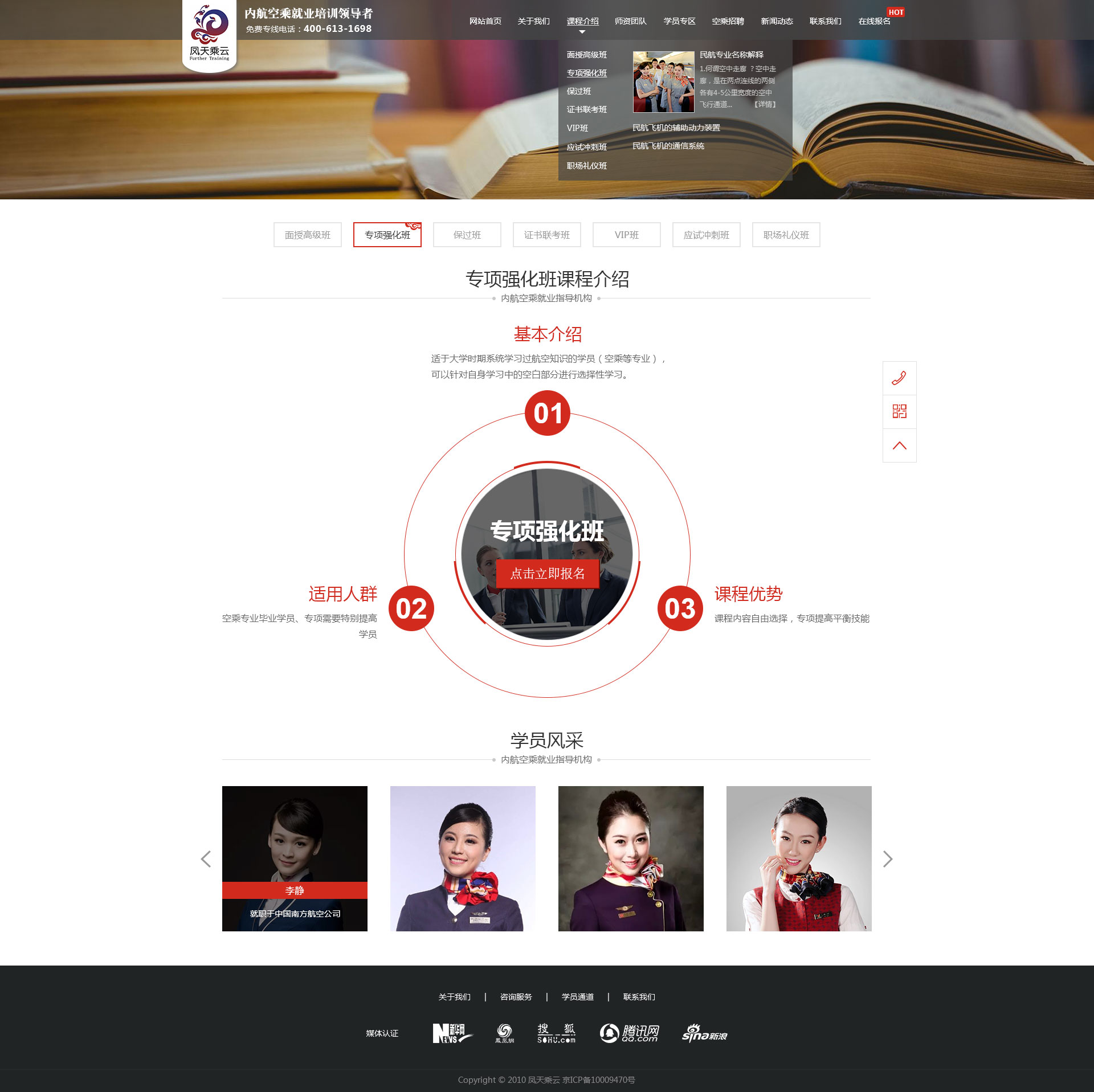 鳳天乘云是內(nèi)航空乘就業(yè)培訓(xùn)的開創(chuàng)者,全國授權(quán)開展航空服務(wù)技能培訓(xùn)的權(quán)威機(jī)構(gòu)之一。